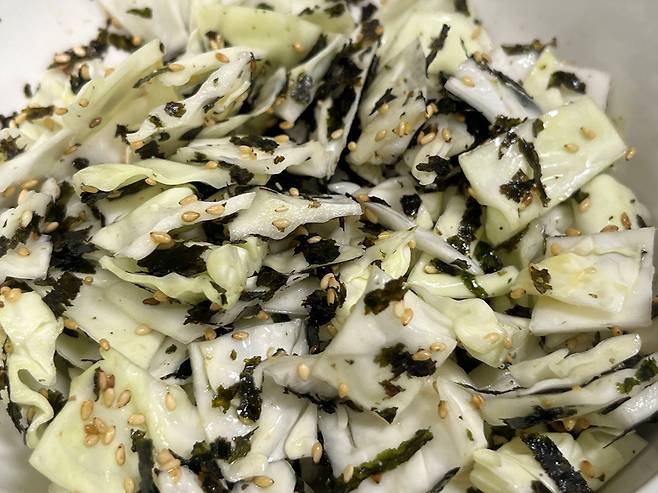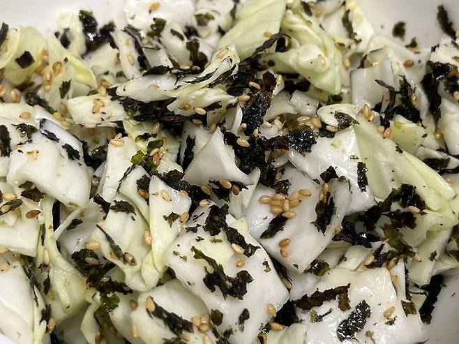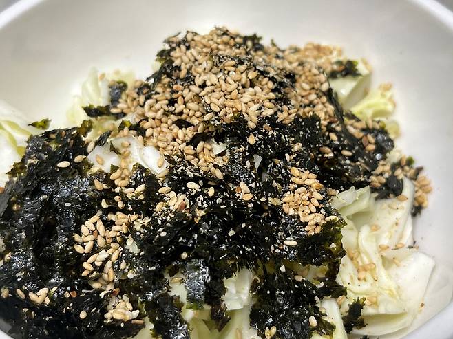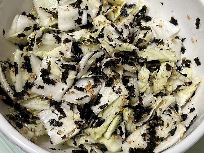 김, 깨, 참기름 등이 양배추와 잘 어우러지도록 섞으세요.