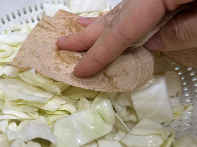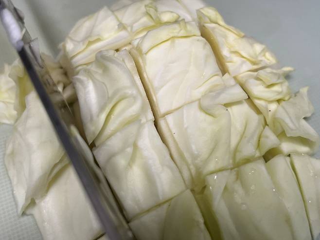 양배추는 사각형 모양으로 썰어 주세요. 그리고 물에 가볍게 한 번 세척합니다.