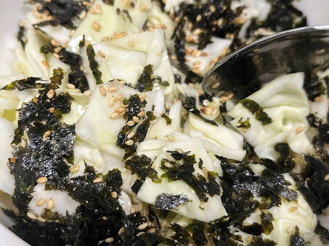 양념이 양배추에 고루 배어 감칠맛이 살아나고 김의 풍미와 고소한 깨, 참기름이 어우러져 깊은 맛을 냅니다.