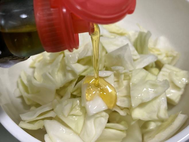 물기 제거한 양배추에 참기름을 2스푼 넣어 주세요. 참기름을 넣으면 양배추 특유의 단맛이 더 잘 살아나고, 고소한 풍미가 더해집니다.