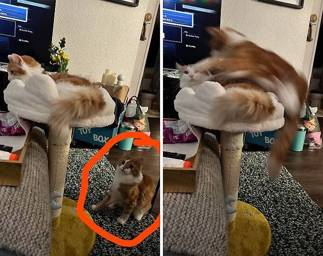 캣타워 꼭대기 자리를 조용히 노리던 고양이가 기어이 형을 몰아내고 왕좌를 차지하는 장면이 온라인에서 화제를 모으고 있습니다.