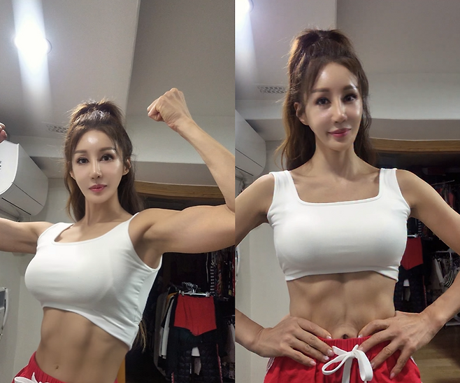 사진 속 김혜연의 모습은 그야말로 '충격'이다. 타이트한 크롭톱 아래로 선명하게 갈라진 식스팩 복근, 힘을 주자 성난 듯 솟아오르는 팔 근육은 20대 전문 트레이너를 방불케 한다.
