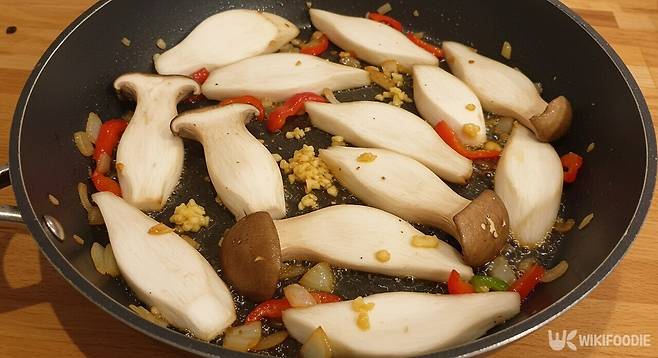 그다음 새송이버섯을 넣고, 중불에서 3~5분 정도 볶아준다. 버섯이 겉이 살짝 노릇해지고 수분이 약간 빠지면, 양파와 파프리카를 추가하고, 재료들이 고루 익을 때까지 1~2분 정도 볶는다.