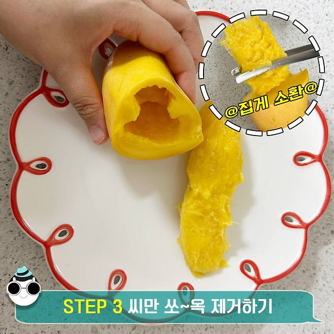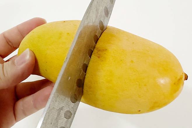 그리고 이때 씨를 분리하면서 씨에 붙은 망고 과육까지 잘려나갈 가능성이 있으니 분리 후에는 망고 과육 깔끔하게 발라주기! 꼭이요★