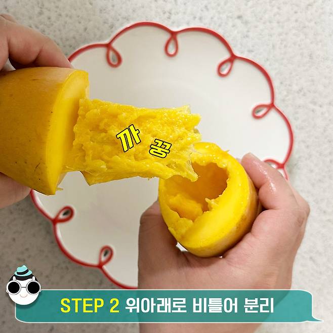 자, 그럼 망고가 분리될듯 분리되지 않은 상태가 되는데요.