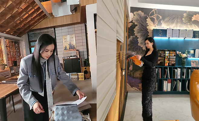 두 번째 사진에서는 블랙 시스루 톱과 독특한 텍스처의 롱스커트를 매치해 모던하고 시크한 분위기를 연출했다. 허리선을 강조한 실루엣과 매트한 소재가 세련미를 더하며, 컬러풀한 인테리어와 어우러져 도시적인 감각을 드러낸다. 손에 든 패브릭 샘플은 그녀의 세련된 취향을 한층 부각시킨다.