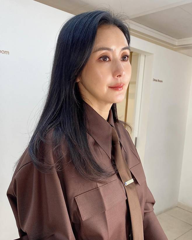 첫 번째 사진에서 최정윤은 브라운 컬러의 셔츠와 동일 톤의 타이로 포멀하면서도 세련된 이미지를 연출하고 있다. 넉넉한 핏의 셔츠와 각진 칼라, 그리고 타이핀 디테일이 더해져 클래식하면서도 현대적인 분위기를 자아낸다. 자연스럽게 흐르는 흑발과 미니멀한 메이크업이 전체적으로 단정하고 고급스러운 느낌을 완성한다.