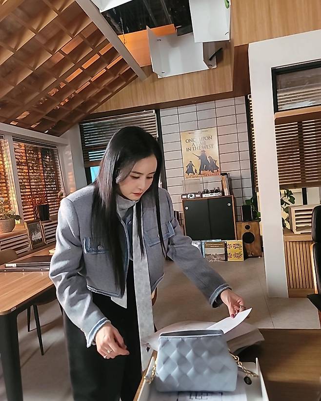 세 번째 사진에서 최정윤은 크롭 기장의 그레이 재킷과 실버 타이, 그리고 블랙 팬츠를 매치해 트렌디한 오피스룩을 선보인다. 재킷의 짧은 기장과 심플한 라인이 경쾌함을 더하고, 파스텔톤 미니백이 포인트 액세서리로 활용됐다. 전체적으로 실용적이면서도 감각적인 스타일링이 돋보인다.
