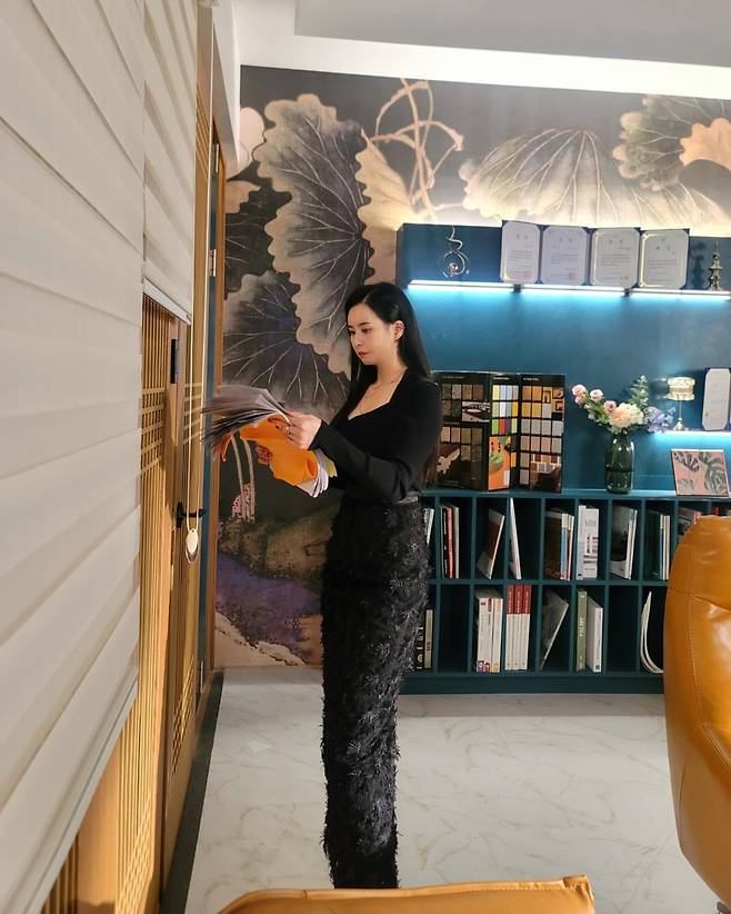 두 번째 사진에서는 블랙 시스루 톱과 독특한 텍스처의 롱스커트를 매치해 모던하고 시크한 분위기를 연출했다. 허리선을 강조한 실루엣과 매트한 소재가 세련미를 더하며, 컬러풀한 인테리어와 어우러져 도시적인 감각을 드러낸다. 손에 든 패브릭 샘플은 그녀의 세련된 취향을 한층 부각시킨다.