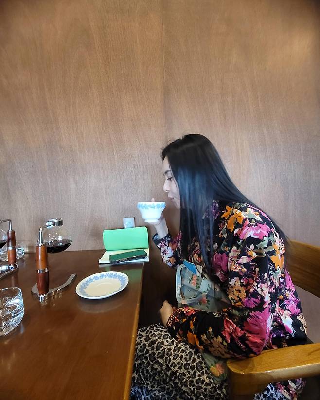 네 번째 사진에서는 플로럴 패턴의 재킷과 애니멀 프린트 팬츠를 믹스매치해 과감한 스타일링을 선보였다. 화려한 색감의 상의와 패턴이 돋보이는 하의가 조화를 이루며, 테이블 위의 심플한 식기류와 대비를 이루어 그녀만의 개성 있는 패션 감각을 드러낸다. 자연스럽게 내린 머리와 미니백이 전체적인 룩에 편안함을 더한다.