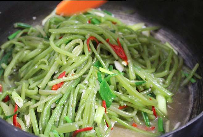 고구마줄기가 적당히 볶아지면 대파를 넣고 한번 더 볶아서 마무리 해요. 색감을 위해 홍고추가 있으면 넣어줘도 좋아요.