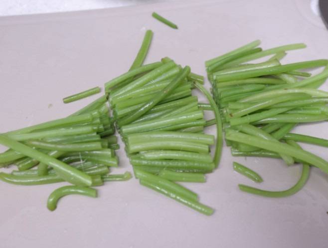 잘 삶아진 고구마줄기는 체에 받쳐 물기를 빼준 다음 먹기 좋은 크기로 잘라서 준비해주세요.