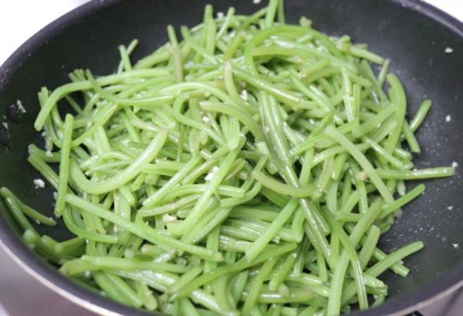 밑간 해놓은 고구마줄기를 팬에 올리고 중불에 볶아요. 들기름을 넣어서 밑간을 했기 때문에 따로 기름을 두르지 않고 볶아줘요. 한번 삶아주었기 때문에 팬에서는 오래 볶지 않아도 된답니다. 너무 오래 볶으면 흐믈거려서 식감이 떨어져요.