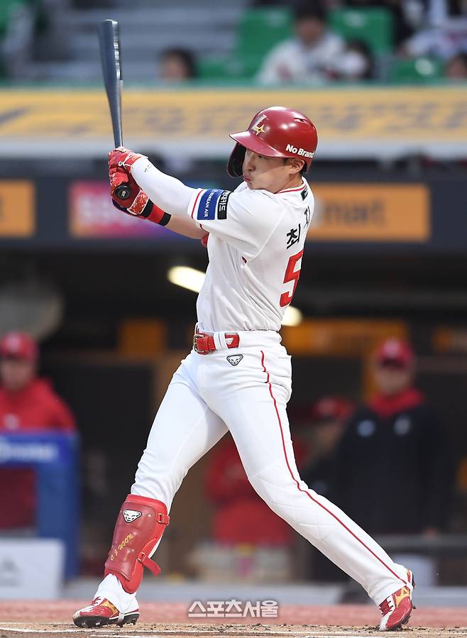 SSG 최지훈이 17일 인천 SSG랜더스필드에서 열린 2025 KBO리그 한화와 경기 1회말 무사 한화 선발 류현진을 상대로 안타를 치고 있다. 2025. 4. 17.