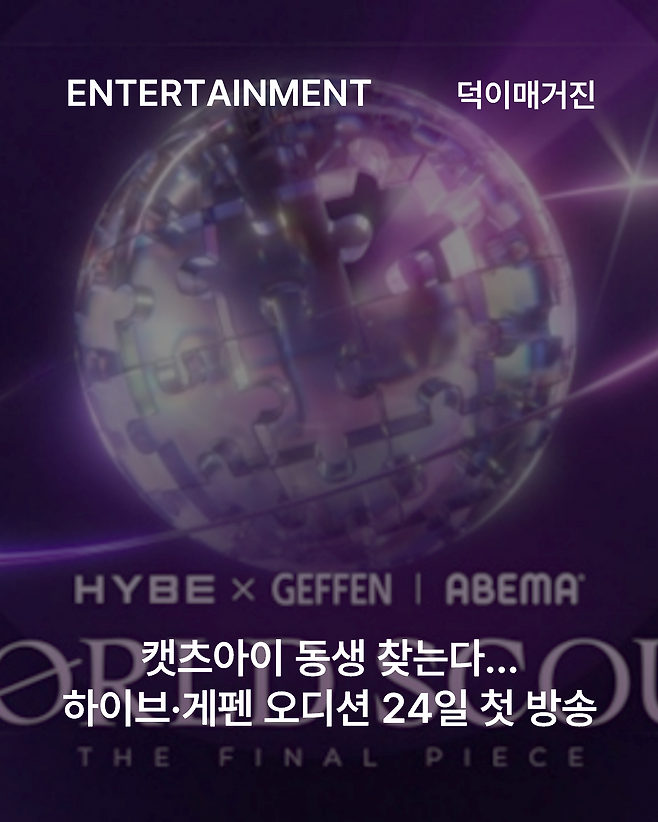 하이브와 게펜 레코드가 글로벌 시장을 겨냥한 두 번째 대형 프로젝트에 나섭니다. 캣츠아이(KATSEYE)의 성공을 이은 신규 걸그룹 탄생 과정을 담은 오디션 프로그램 ‘월드 스카우트: 더 파이널 피스(WORLD SCOUT: THE FINAL PIECE)’가 오는 24일 오후 8시 일본 OTT 플랫폼 아베마(ABEMA)를 통해 첫 방송됩니다.