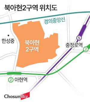 이 땅은 2008년부터 북아현2구역으로 묶여 재개발 사업을 진행하고 있다. 현재는 낡은 단독주택과 빌라가 빼곡하지만 앞으로 재개발을 통해 지하 3층~지상 29층, 28개동, 2320가구 규모 대단지 새아파트로 재탄생할 예정이다. 시공은 삼성물산 건설부문과 DL이앤씨 컨소시엄이 맡는다.
