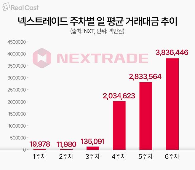 15일 NXT에 따르면, 4월 1일부터 4월 14일까지의 거래대금은 총 거래대금은 34조 6731억 원으로 집계됐습니다. 이는 거래종목이 800개 가까이 늘어난 영향으로 풀이됩니다. 일 평균 거래대금은 3조 4673억 원 수준입니다. 거래종목이 350개였던 이전 일 평균 거래대금(2조 346억 원)과 비교해서는 70% 이상 늘어난 수치입니다.