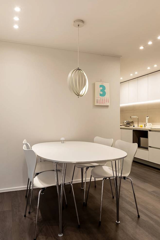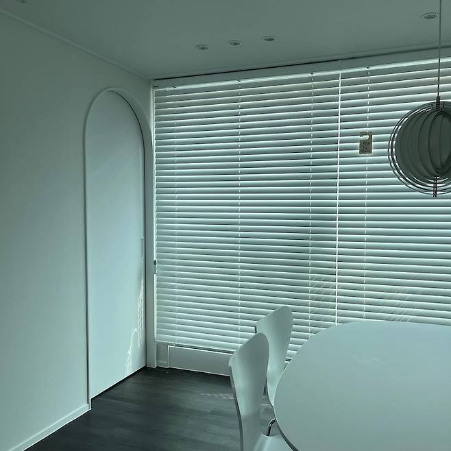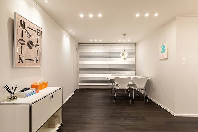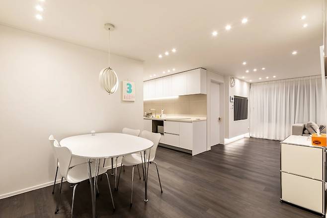 거실과 연결되는 다이닝룸 공간입니다. 가구는 화이트톤으로 맞추고 조명으로 분위기를 더해 주었어요.