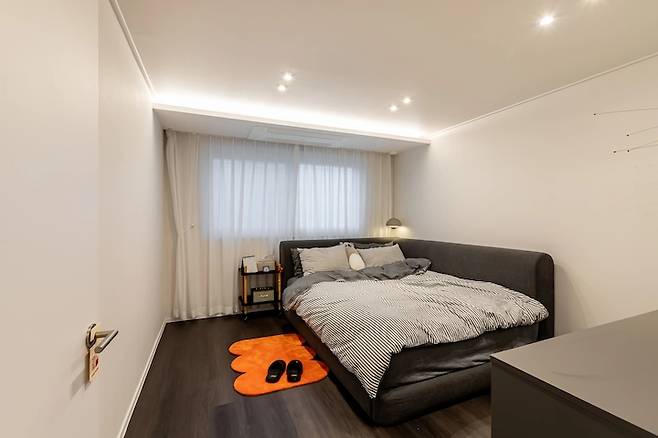 원래는 이 안방을 드레스룸으로 쓰고 싶었어요. ( 붙박이장을 많이 짜서, 옷도 넣고 이불도 넣고 계절가전도 넣고 화장대도 넣고 그렇게 여유롭게 수납하고 싶었거든요 ) 그런데 안방에 시스템에어컨을 해야 했고, 작은방 두 개에 침대가 들어가면 너무나도 꽉 차는 사이즈라, 어쩔 수 없이 이 큰방이 침실이 되었네요.