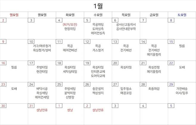 이렇게 1월 한 달 동안 스케줄을 짜서 인테리어 계획을 세웠어요.