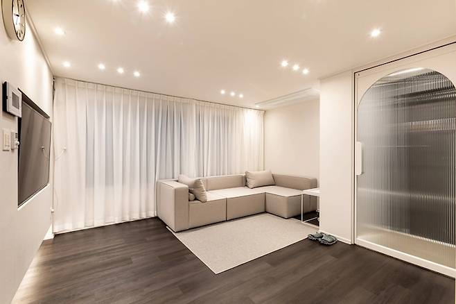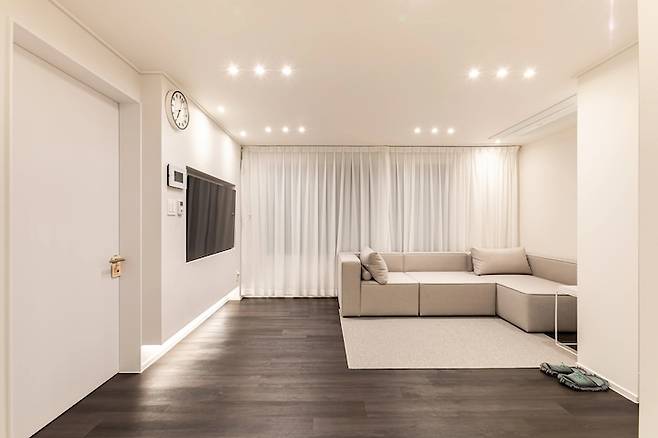 짠! 소파 사이즈를 제외한 자리에 가벽을 세워 신발장 위치를 반대로 옮기고 중문을 설치했습니다. 소파는 이사 오기 전부터 사고 싶었던 '무니토 타임리스 모듈 소파'에요. 3가지 모듈 구성으로, 이렇게 저렇게 구조 바꿔가며 배치할 수 있는 게 너무 매력적이었어요.