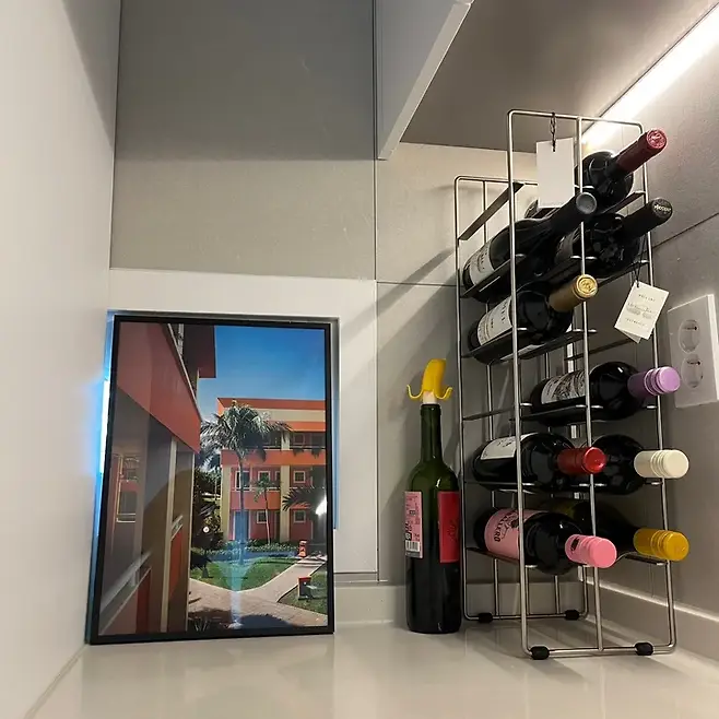 냉장고 옆 빈자리에는 와인을 보관하고, 허전한 것 같아서 액자도 하나 두었어요 ( 매난국죽 창문도 가리고요ㅋ )