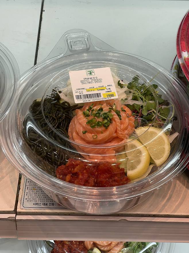 새콤달콤한 물회소스가 연어와 찰떡 궁합이에요.