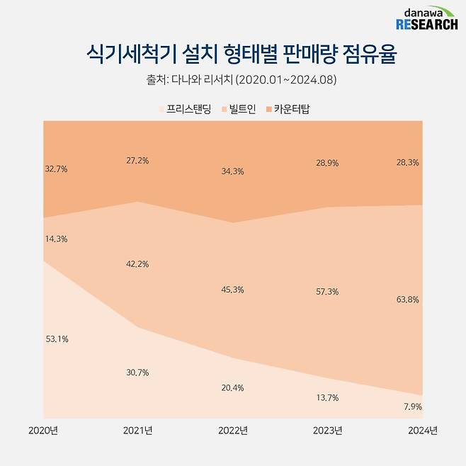 빌트인 식기세척기의 점유율은 2020년 14%에서 2021년 42%로 껑충 뛰어올랐고 2024년에 63.8%를 차지하며 대세로 자리 잡았다. 빌트인의 인기는 깔끔한 주방 인테리어 선호하는 현상이 반영된 것으로 보인다. 몇 년 전부터 삼성전자와 LG전자는 빌트인 가전제품을 프리미엄 포지션으로 잡고 가전제품 출시 전략에 반영하고 있다. 특히, 삼성전자는 14인치 비스포크 식기세척기 등 일부 프리미엄 제품을 빌트인으로만 출시하기도 한다.