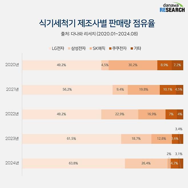 SK매직의 빈자리는 국내 가전 업계의 양대산맥 LG전자와 삼성전자가 채웠다. 두 기업은 2019년 후발주자로 식기세척기 시장에 본격 진출했고 2020~2021년부터 비스포크, 오브제컬렉션에 식기세척기 라인을 추가하면서 점유율을 빠르게 확보했다. 2024년 8월 기준 LG전자와 삼성전자의 점유율은 90.2%로 압도적인 우위를 점하고 있다.
