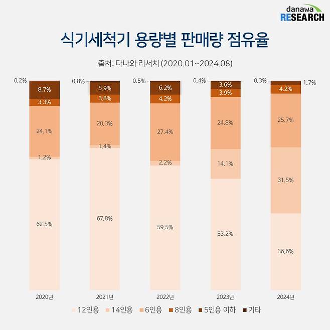 식기세척기에도 거거익선이 통한다. 최근 5년간 거래된 식기세척기 용량은 보면 12인용과 14인용이 인기를 얻고 있다. 특히, 14인용은 2020년 1.2%에서 2024년 31.5%로 약 30배나 급성장했다. 14인용 제품이 인기를 끄는 이유는 가전의 불문율인 거거익선 트렌드에 맞춰 용량을 더 키우고 기능을 추가하는 프리미엄화가 진행되고 있기 때문으로 추정된다.
