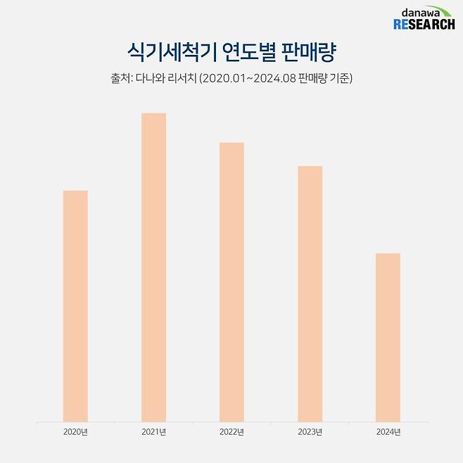 다나와 리서치를 통해 살펴본 최근 5년간의 판매량을 살펴보면 2021년 깜짝 반등 이후로 내리막길을 걷고 있다. 올해 판매량은 8월까지의 통계라 하반기 혼수, 이사 시즌을 감안하면 2023년 판매량과 비슷하게 기록할 것으로 보인다. 2021년에 보인 성장세는 코로나의 영향으로 인한 집콕 생활로 집밥 수요가 늘고 위생에 대한 관심도가 증가하면서 나타난 현상으로 추정된다. 코로나 팬더믹이 끝난 2023년부터 판매량이 떨어지고 있는데 원인은 1인 가구의 증가에서 추정해볼 수 있다.