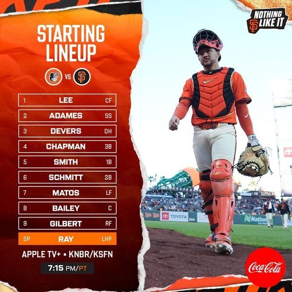 샌프란시스코는 이정후(중견수)-윌리 아다메스(유격수)-라파엘 데버스(지명타자)-맷 채프먼(3루수)-도미닉 스미스(1루수)-케이시 슈미트(2루수)-루이스 마토스(좌익수)-패트릭 베일리(포수)-드루 길버트(우익수) 순으로 라인업을 구성했다. 선발 투수는 로비 레이다.
