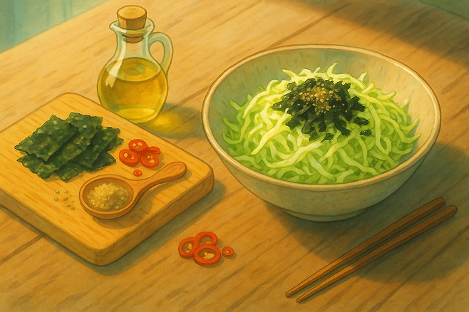 • 따뜻한 버전 : 양배추 살짝 데쳐 물기 제거 → 김·들깨·오일로 조물조물.