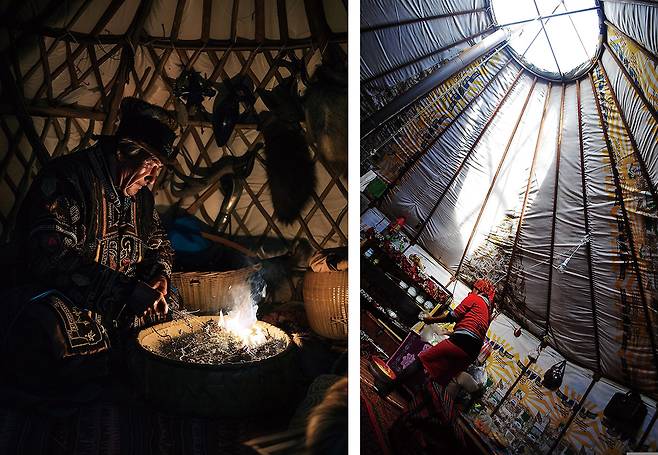 인디언의 티피, 몽골족의 게르나 칼무크족의 유르트에도 중앙에는 불이 있었고, 여기가 빠져나가도록 만든 구멍이 있었다. 나중에는 연기 구멍의 역할이 마당을 대신한 것이라 본다.