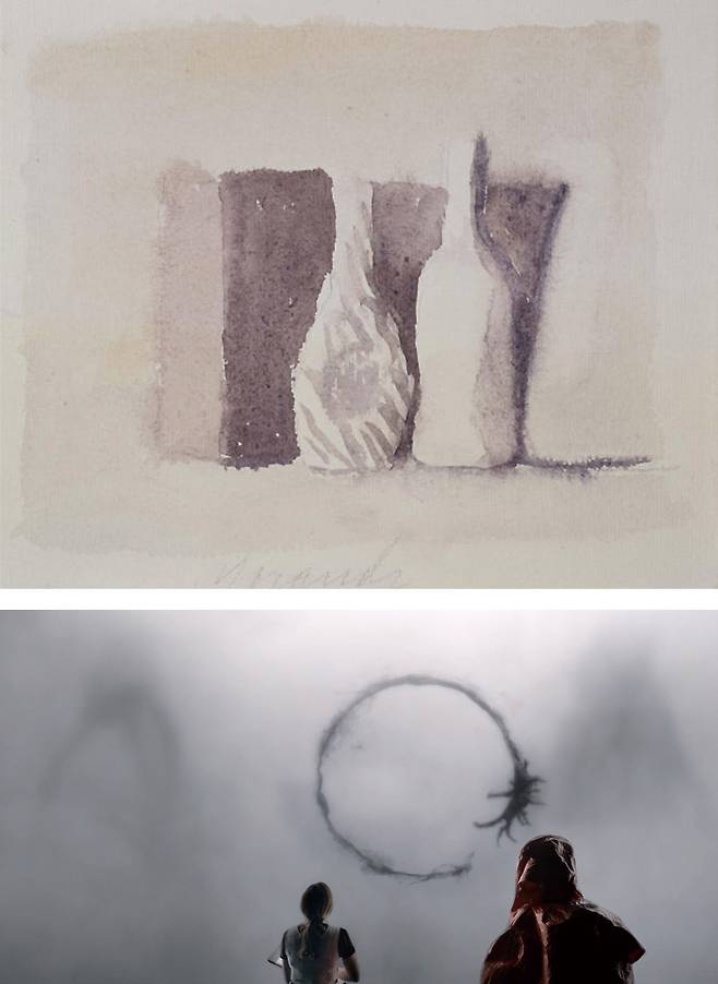 마당을 생각하면 여러 이미지가 떠오른다. 같은 초점에 장시간 타임랩스로 찍은 별이 가득한 밤, 온함, 고요함, 그리고 사물은 지워지고 ‘사이’만 남은 조르조 모란디(Giorgio Morandi)의 말년 정물화와 경계선이 뚜렷하지 않은 마크 로스코(Mark Rothko)가 그린 사각형의 <무제(Untitled)>가 생각난다. a0100z의 머릿속을 떠다니는 마당의 강렬한 이미지는 드니 빌뇌브가 연출한 영화 <컨텍트(Arrival, 2017)>가 아닐까. 안개인지 연기인지. 인터뷰룸에서 ‘헵타포드’라는 외계인이 손 혹은 발에서 뿜어져 나온 연기로 찰나적 순간 도넛 모양의 문자를 만들어내고 서서히 사라진다.