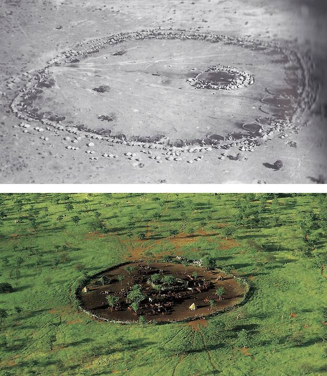 ‘家’를 가장 이해하기 쉬운 아래 그림은 잠비아 목동들이 사는 마을을 촬영한 사진이다. 버섯 모양의 집들이 가운데를 중심으로 원을 그리며 큰 마당을 둘러싸고 있다. 그리고 집 앞에는 나무 울타리가 있어 그곳에 가축을 가두어 두는 형태이다. 말리 도곤족의 주거는 가(家)의 의미를 잘 보여주는 형태라 하겠다. 집들은 가족 마당을 둘러싸는 형태로 자리 잡고 있으며 주요 주택과 곡식 창고, 보조 오두막들이 돌담으로 연결된다. 마당은 가족의 중요한 생활공간으로서, 건기에는 부엌이자 작업장이며 가족 소유의 가축우리기도 한다. 마당을 주거가 무리를 지으며 둘러 싸는 것은 생계형 농업경제에 의존하는 사회에서의 보편적인 무리주거 형태이다.