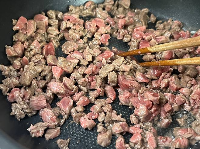 소고기는 약 150g 정도를 기름 없이 볶아 냅니다. 기름기 없는 부위를 사용하면 담백하면서 고소한 맛을 낼 수 있습니다.