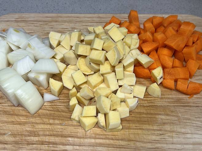 양파, 고구마, 당근 등은 껍질을 제거한 후 먹기 좋게 잘라 주세요. 그 외에도 파프리카, 감자 등을 넣어도 카레와 잘 어울립니다.