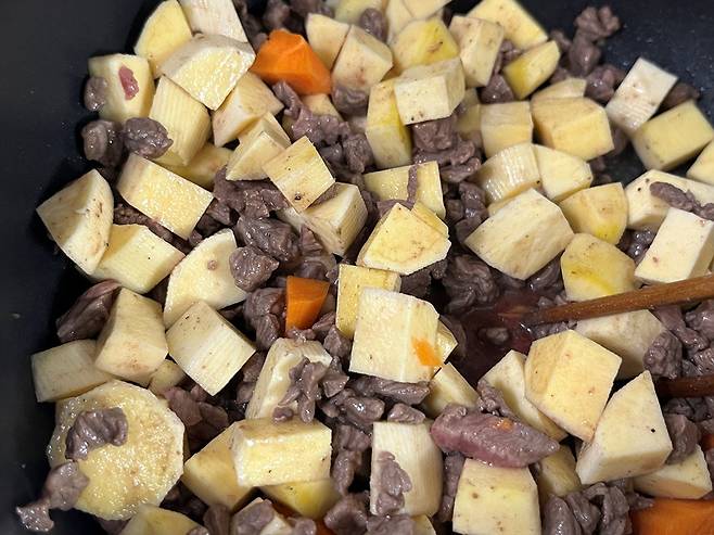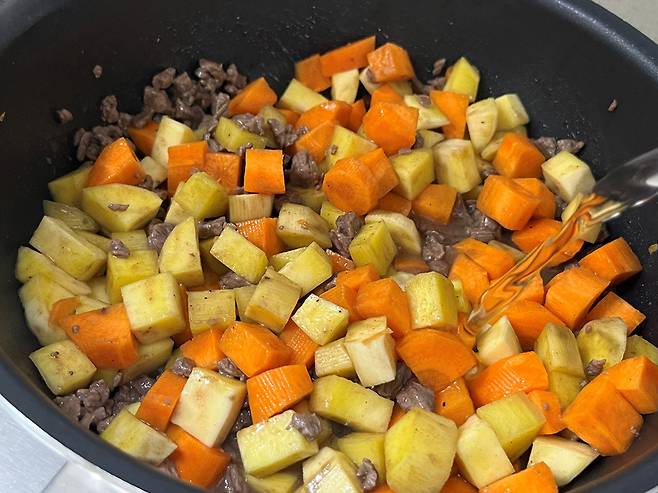 고기가 어느 정도 익으면 딱딱한 야채부터 넣고 볶아 주세요. 고기에서 나온 기름에 야채를 볶으면 고기의 풍미가 야채에 스며들어 감칠맛이 훨씬 깊어집니다.