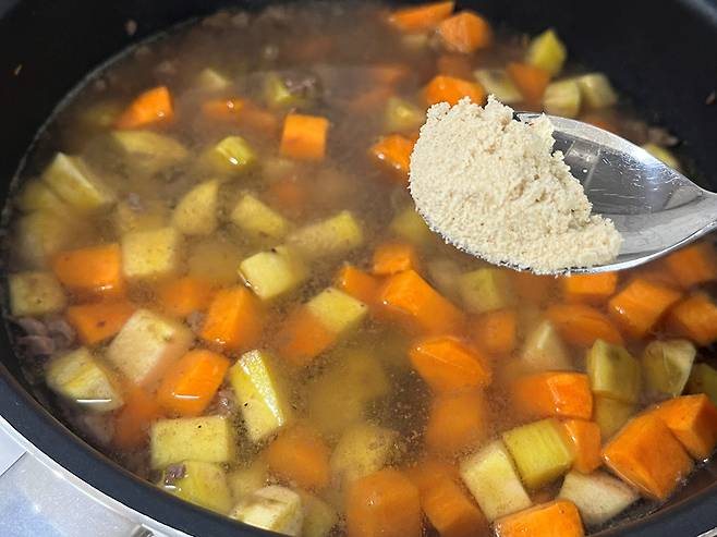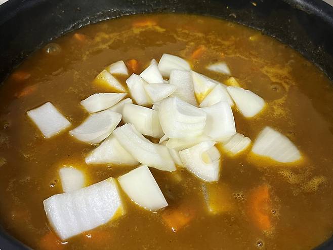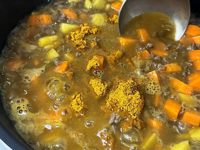 그다음 카레 가루를 넣고 덩어리가 지지 않게 잘 풀어 주세요. 이때 불은 약불로 줄이고, 주걱이나 거품기로 저어가며 가루가 고르게 섞이도록 하는 것이 중요합니다. 농도를 봐가며 물을 추가해 주세요.