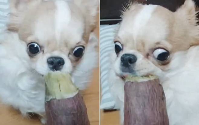 여기에 한발 더 나아가 두 눈을 휘둥그레 뜬 채로 고구마를 먹는 치와와 강아지 모습이 너무 인상적일 따름입니다.