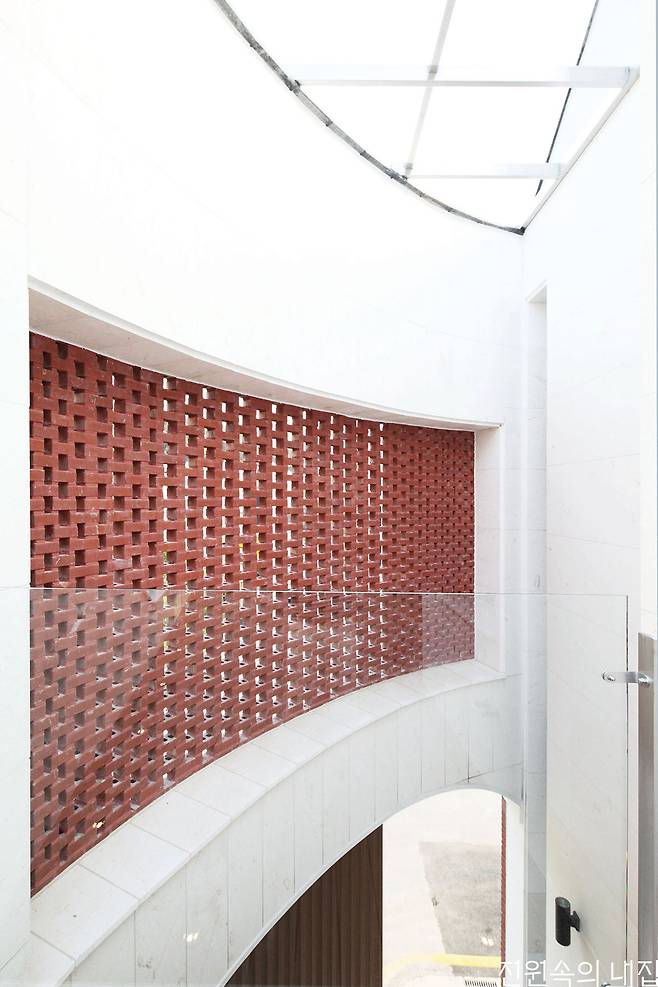 외부마감재 : 벽 – 점토벽돌(적벽돌), 라임스톤(루나크림)