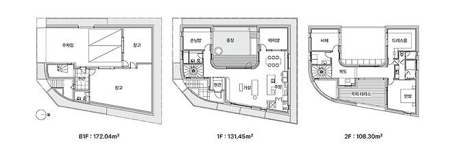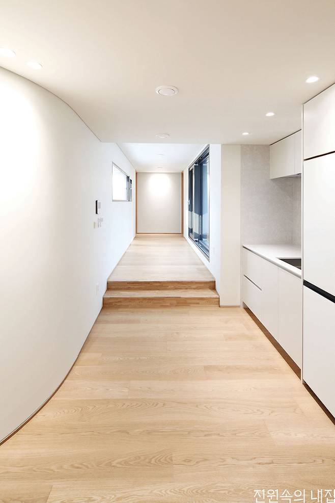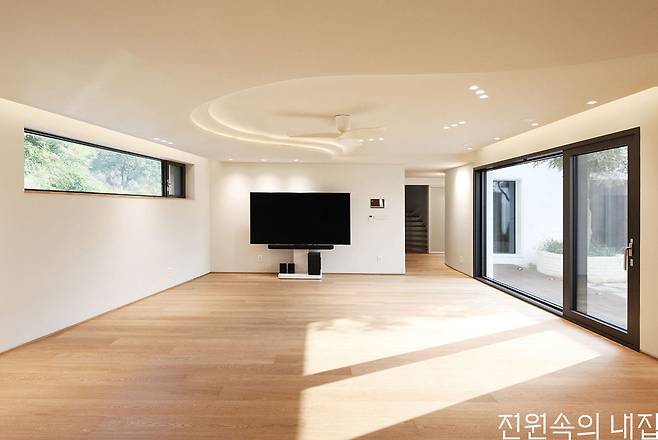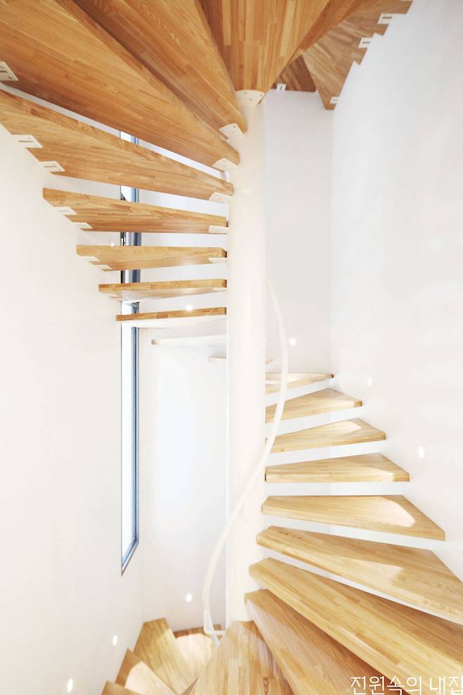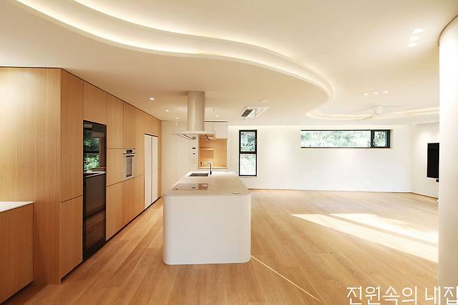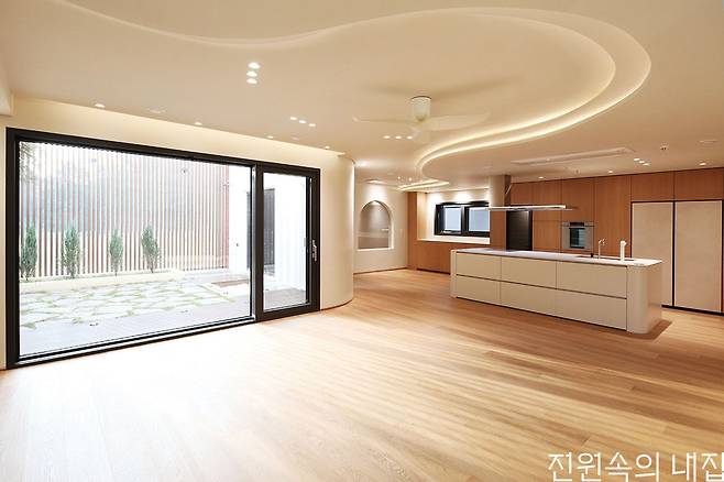 1층은 출입구로 시작해 중정과 연결된 거실로 이어지는 구조다. 중정은 자연을 매개하는 집의 핵심 공간으로, 거실, 복도, 방은 중정을 중심으로 배치되어 사계절의 변화를 일상에서 느낄 수 있게끔 했다. 거실의 천장은 물결치는 듯한 디자인으로 ‘선이 흐르는 풍경’이라는 전체 분위기를 잘 표현하고 있다. 내부 평면은 라운드 형태로 계획되어 아이에게 동적이면서도 안전한 공간을 제공한다. 주방은 거실, 식당, 중정과 연계되어 동적인 생활 공간으로 기능한다. 2층은 부부의 사적인 공간으로 구성되어 있으며, 침실, 드레스룸, 욕조, 서재 및 외부 테라스가 유기적으로 연결되도록 설계되었다.