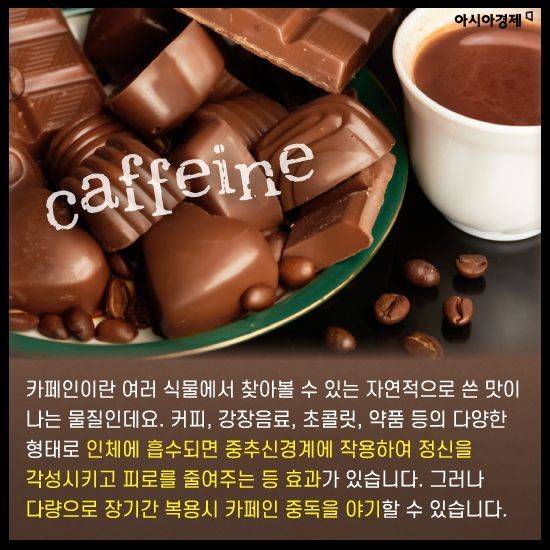 여기에 청소년이 많이 섭취하는 커피 우유도 얕봐선 안 된다. 편의점에서 흔히 볼 수 있는 한 500㎖ 용량의 커피 우유에는 240㎎의 카페인이 함유돼있다. 최근에는 커피 대신 '과라나'라는 열대과일이 함유된 다양한 카페인 가공식품도 가세했다. 과라나는 브라질, 파라과이의 아마존 밀림 지대 등에서 자라는 열매로 씨앗에 카페인 성분이 들어있다. 과라나가 함유된 고카페인 젤리, 캔디, 추잉검 등은 '수험생용', '졸음을 깨워주는', '집중력 향상' 등 수식어가 붙은 채 판매되고 있다. 해당 젤리 제품의 카페인 함량은 개당 75㎎∼100㎎이다. 실제로 저가형 카페에서 판매하는 대용량 커피 한 잔만 마셔도 청소년 하루 카페인 권장량 이상의 카페인을 섭취하게 된다. 한 커피 브랜드 대용량 커피 한잔(946㎖)에 들어있는 카페인 함유량은 290.8㎎으로, 청소년 하루 카페인 권장량(몸무게 60㎏ 청소년 기준 150㎎)을 훨씬 웃돈다.