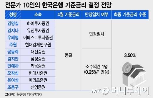 9일 머니투데이가 채권시장 전문가 10명을 대상으로 조사한 결과 응답자 모두 금통위가 지난 2월에 이어 4월에도 기준금리 동결할 것으로 예상했다.