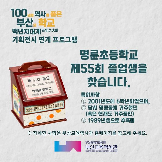 부산광역시립중앙도서관는 '명륜초등학교(1917년 개교) 제55회 졸업생 타입캡슐 봉인 해제' 프로그램을 추진하기 위해 졸업생을 찾는다고 5일 밝혔다.