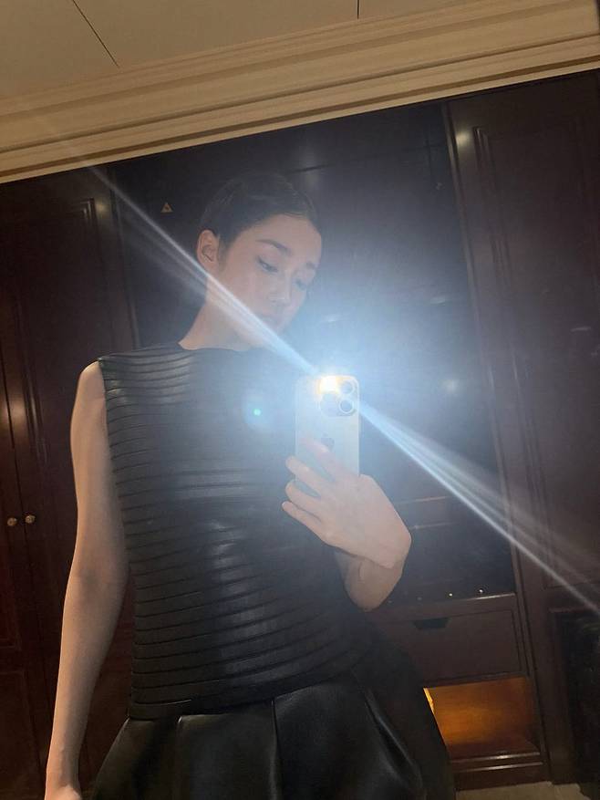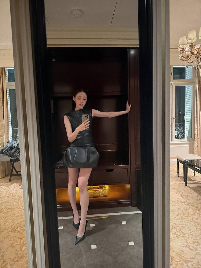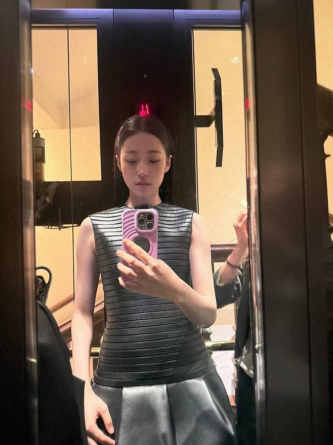 이날 노윤서가 선택한 드레스는 그 자체로 하나의 '조각상'이었다. 정교하게 조형된 가죽 소재의 상의는 갑옷처럼 단단한 인상을 주면서도,