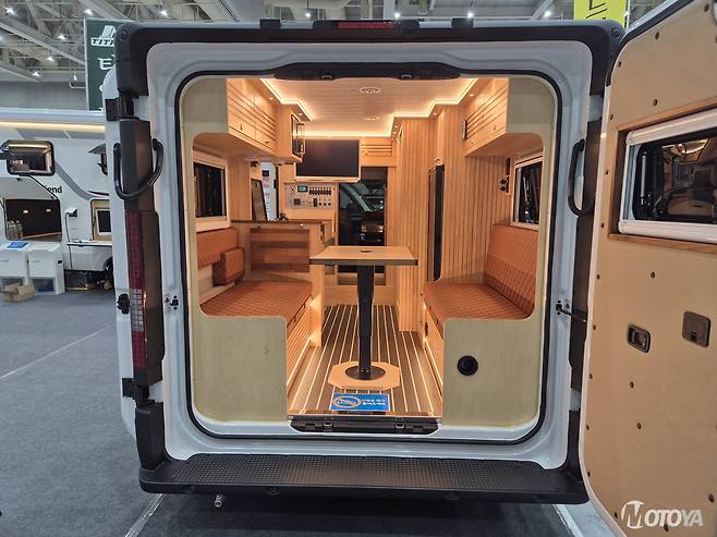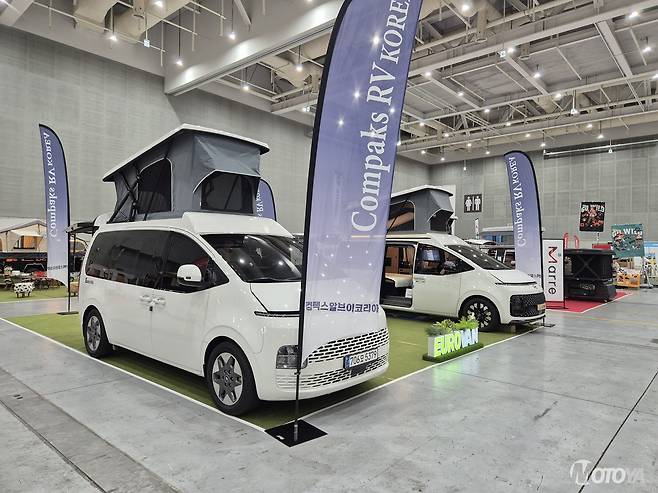 현대 스타리아 기반 캠퍼밴으로 인기를 끌고 있는 컴팩스알브이코리아는 새로 개발 중인 '유로밴 오아시스'를 시제차로 출품했다. 이 모델은 오아시스처럼 솟아나는 가변식 욕실을 갖추었고, 신형 '플렉스 루프'와 결합해 기존 스타리아 캠퍼밴의 한계였던 화장실 공간 문제를 해결했다. 아직 개발 단계이지만, 소비자 피드백을 적극 반영해 양산형 모델의 완성도를 높인다는 계획이다.