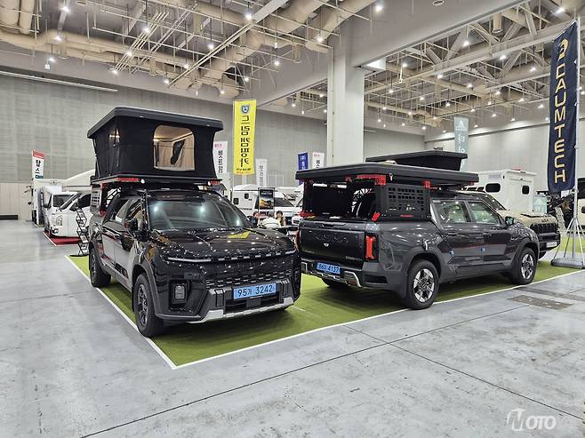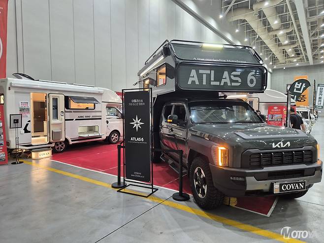 기아의 화물차 스포일러를 제작하는 1차 벤더사 코반캠핑카는 타스만 기반 신모델 '아틀라스6'를 선보였다. 전체 높이 3.2m에 달하는 대형 구조를 자랑하며, 4인 가족 사용에 최적화된 넓은 내부 공간을 제공한다. 알루미늄 소재를 적극 사용해 경량화를 이루는 동시에 안전성을 확보했고, 험지 주행과 중량 배분까지 고려해 신뢰성을 높였다. 현재는 타스만 기반으로 제작됐지만, KGM 무쏘 칸에도 동일한 캐빈 적용이 가능하다.