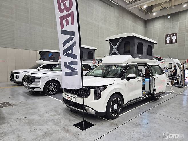 카니발 기반 '큐브밴' 시리즈로 잘 알려진 오토홈스는 현대자동차의 대형 SUV 팰리세이드에 전동 4주식 팝업텐트를 장착한 '큐브밴 PL' 시리즈를 선보였다. 기존 큐브밴 4AT에서 사용하던 팝업텐트를 그대로 적용했으며, 폭 1,300mm의 국내 최대 수준 텐트를 탑재해 여유로운 공간을 자랑한다. 또한 루프에는 이중·삼중 안전장치를 더해 안전성까지 확보, 차박 경험을 극대화했다.